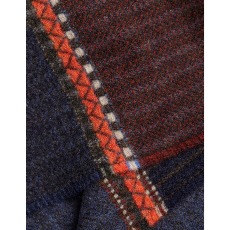 An inky combination of cool denim, sienna, and navy form the base of this scarf, occasionally intersected by a a dramatic touch of fiery orange, sage, and bright blue details.